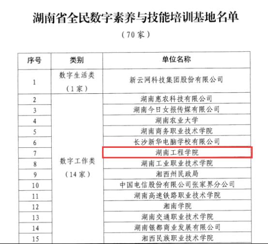 近日,经市州申报、部门审核、专家评审等环节,省委网信办、省委党校(湖南行政学院)、省教育厅、省科技厅、省工业和信息化厅等15家单位联合评选认定了70家湖南省全民数字素养与技能培训基地,我校由党委副书记向前牵头,网络信息与现代教育技术中心、信息科学与工程学院、设计艺术学院、经济学院等多部门联合申报的“365英国上市全民数字素养与技能培训基地”成功入选数字工作类培训基地。
